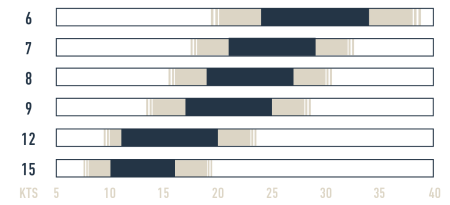 The wind range chart is to be used as a point of reference. It is based on a rider who weighs around 75kg (165lbs.) Actual use will vary depending on your weight, skill level, board size/type (twintip or hydrofoil) and wind conditions on water or land. When choosing a kite size, always use common sense and repeatedly choose a smaller size if you are not sure, especially when using the kite on land.